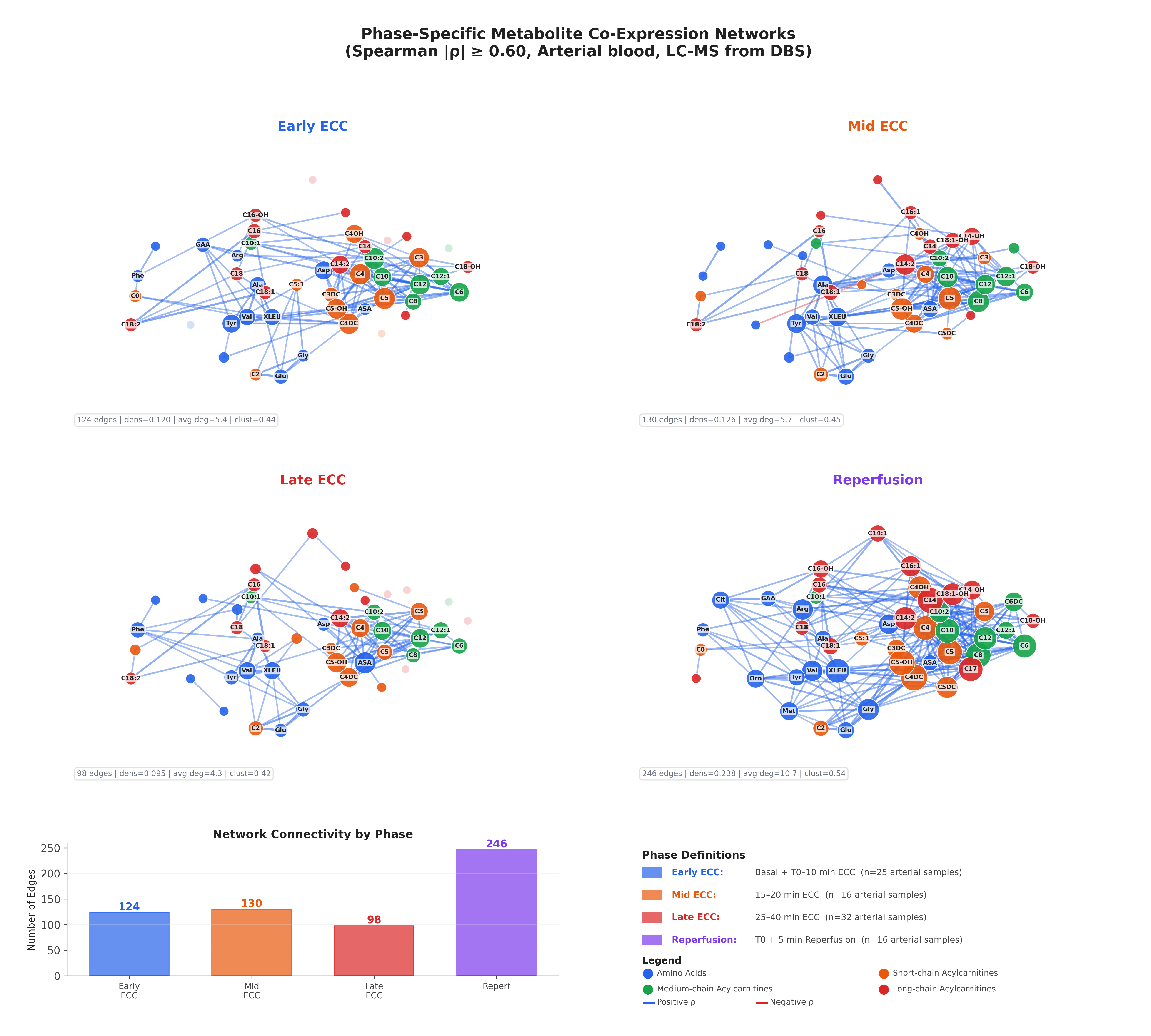 Arterial blood samples were collected at serial timepoints during CPB and spotted onto Whatman 903 Protein Saver DBS cards. Metabolite co-expression networks were constructed using Spearman correlations (|ρ| ≥ 0.60) for each surgical phase: Early ECC (Basal + T0–10 min, n=25), Mid ECC (15–20 min, n=16), Late ECC (25–40 min, n=32), and Reperfusion (T0 + 5 min, n=16).